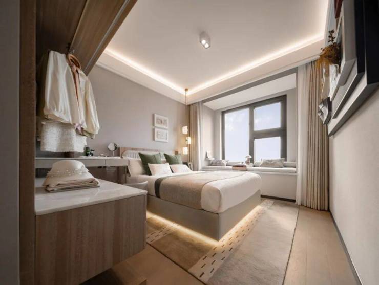 值得一提, 主卧套房空间阔绰,刚需面积改善的尺度,摆两个床头柜和衣柜空间都绰绰有余,床尾即使再放置柜子也不影响过道通行。