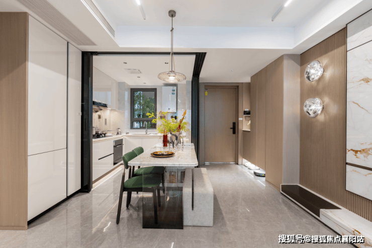 比如精装一体化的玄关交付,不仅配色协调,包墙板交付,更采用宝格丽白的天然石材。