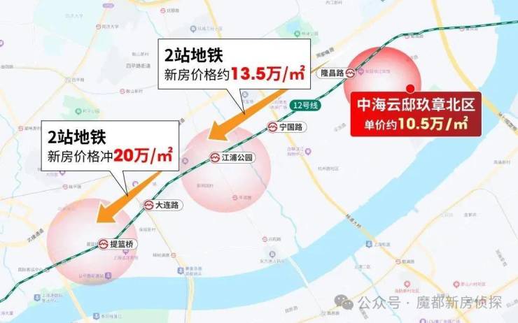 我们沿着地铁线路看价格,项目出发2站地铁就是江浦公园,这里的新房已经要约13.5万/㎡。相比云邸玖章10.5万/㎡的单价, 地铁2站贵3万/㎡ ,安全垫不言而喻!