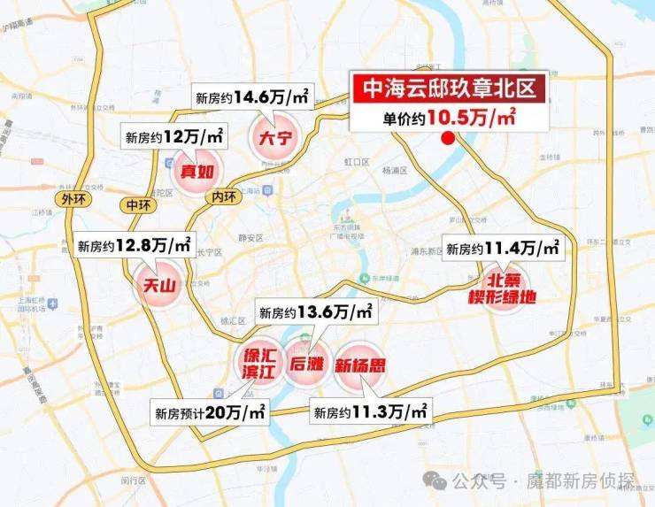 展开地图可以看到,徐滨上半年绿城19.5万/㎡售罄,即将上市的新房预计超20万/㎡。后滩项目均价约13.6万/㎡,大宁项目约14.6万/㎡,其他内中环板块绝大多数都超过11、12万/㎡!