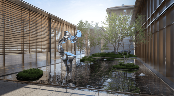 水作为贯穿兴云间整座园区最重要的元素之一,主入口处的 水景雕塑 《晓风艺墅》具有至关重要的地位,金属的光泽与水光的灵动交相辉映,成为空间中的点睛之笔。