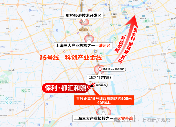 1、正地铁房+产业金线,通勤置业双优: 项目直线距离约500米就是15号线双柏路站,通勤便捷度拉满。