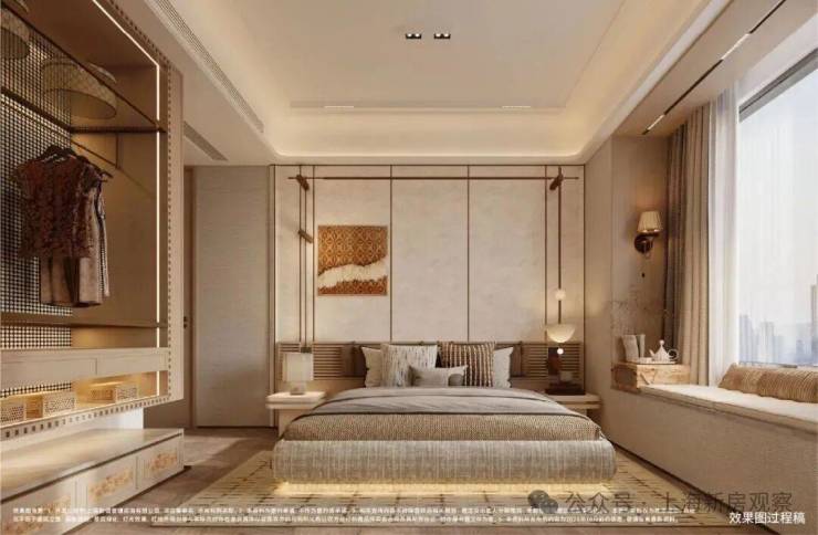 270°无柱飘窗的主卧套设计,打造出一座“空中观景舱”,将晨昏光影、四季流转尽数收纳,极大拓展了生活的视觉与心理边界,推窗即览美景,让居家时光更具诗意。