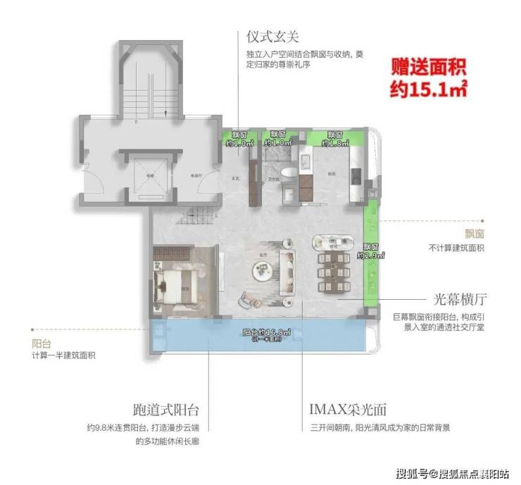 户型亮点 :三开间朝南,南向面宽超 9.8 米,全景采光;南北通透,空气对流顺畅;LDKB 一体化设计,餐客一体衔接景观阳台,空间开阔大气;主卧套房配独立卫浴与衣帽间,双次卧设计,私密性与实用性兼具;全明户型,无暗室暗卫;全屋多飘窗不计入产证面积,增约 8㎡,得房率约 82%。