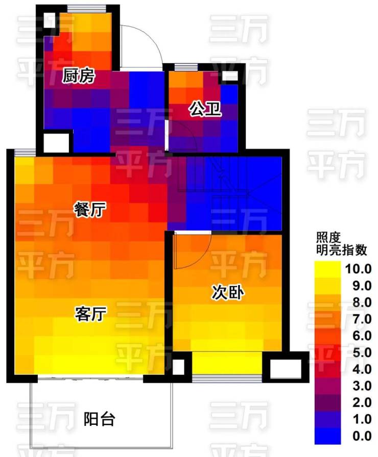 约3.2米层高,采光极好。 三万平方也做了专业的采光分析,如下图所示,颜色代表亮度,黄色最亮红色一般蓝色最暗。可以看到在白天,主要房间 靠自然光线就可以很明亮 ,幸福感立涨25%。