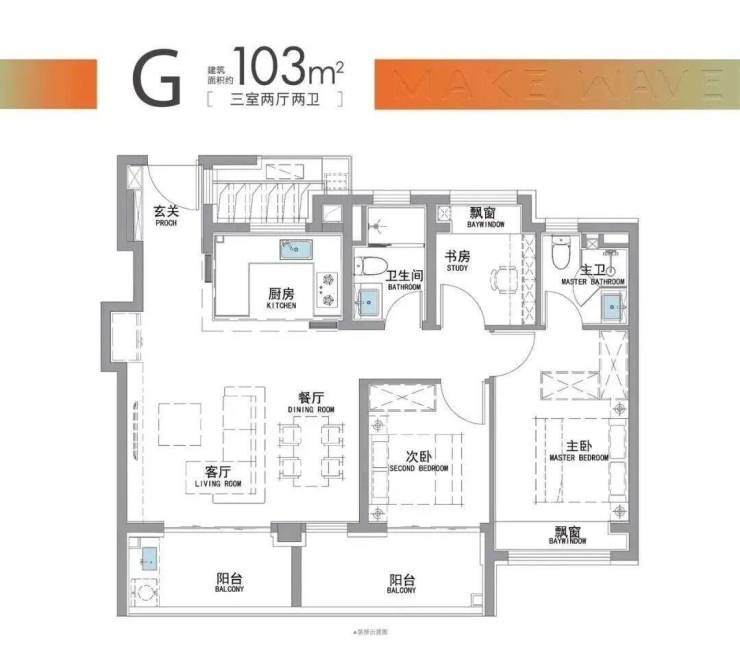 值得一提的是,该户型做到了 “南向双阳台+南北双飘窗” 的设计,在实用性上超越了市场上许多同面积段的产品。