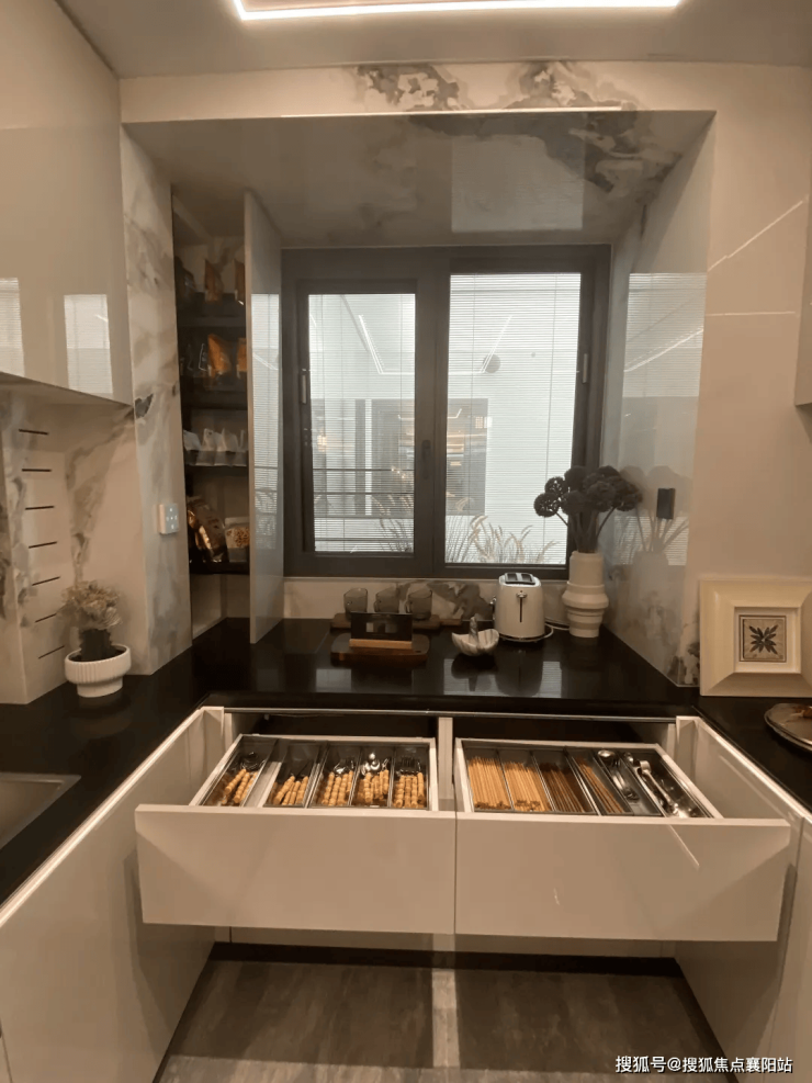 厨房在赠送的飘窗台面上加了两个大容量抽屉,总体形成深U形布局,台面有效操作长度达到5米,收纳量达到3.1m³,相当于一辆中型面包车满载的载货量。就连飘窗与管井结合的壁龛处也装了抽拉架,调料、香料、干货等用品可整齐收纳,取用方便。