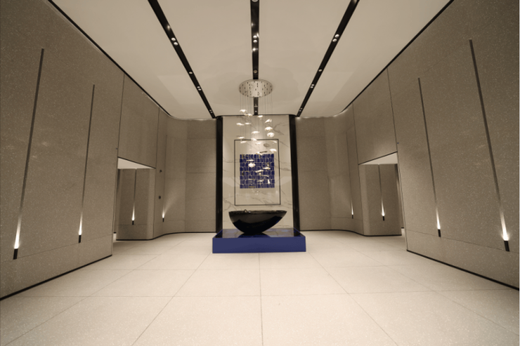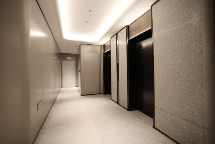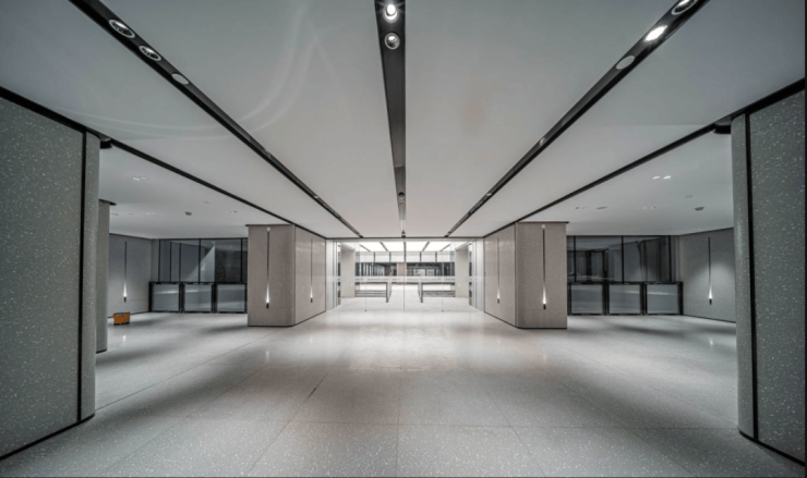 大堂墙面全部采用定制弧面铝板,每一个弧面都代表着经费。