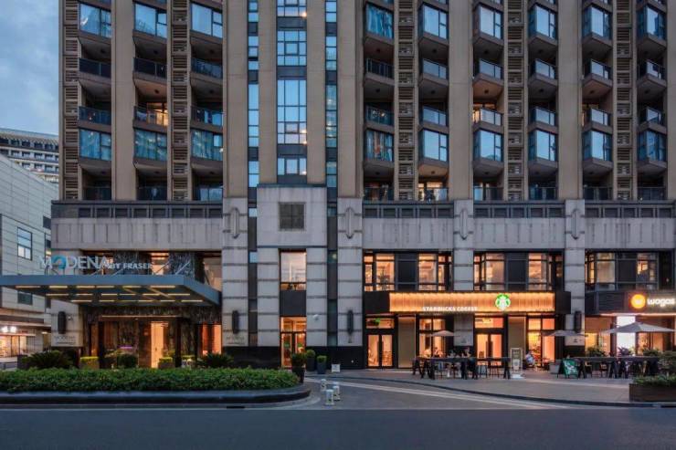 外立面采用 都市现代风格 ,以现代手法诠释古典精神,采用低碳环保的铝合金板装饰,以造车的细节标准打造建筑,体现超强的精工品质和高级感。从阿斯顿马丁概念汽车设计中获得灵感,采用经典且摩登的色彩搭配,以弧度、材质对比和建造细节来呈现建筑的高级感和新古典主义气质。