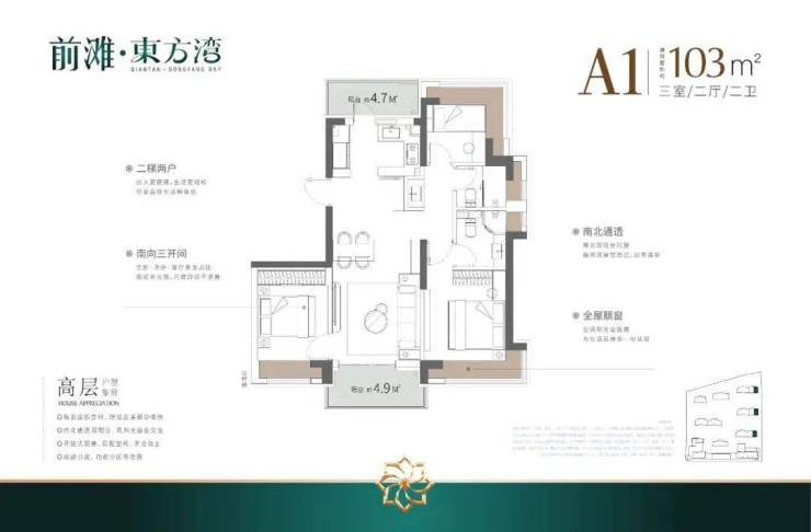 建面103㎡3房2厅2卫, 户型三开间朝南、室内 “5个飘窗+2阳台” ,不管是采光、视野、通风、私密性,还是实用性都十分出色。