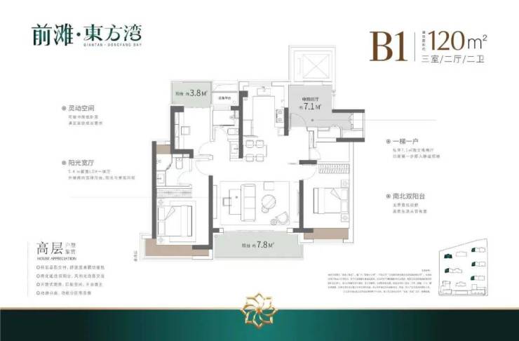 建面约120㎡3房2厅2卫, 做到了3开间朝南+双阳台+主卧套房设计+270°转角飘窗,居住体验、舒适度、尺度感倍增。