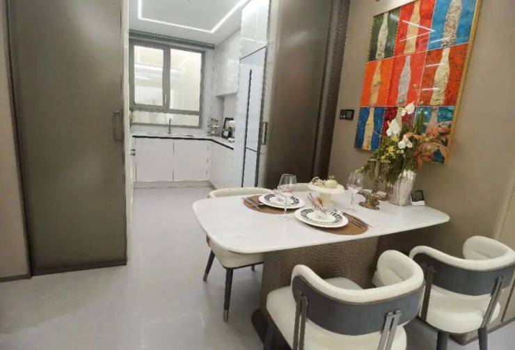 LDKB一体化设计,约5.4米超大面宽客厅搭配同尺度阳台,公区的贯通性被加强,从北到南,厨房、餐厅、客厅、阳台全部打通。