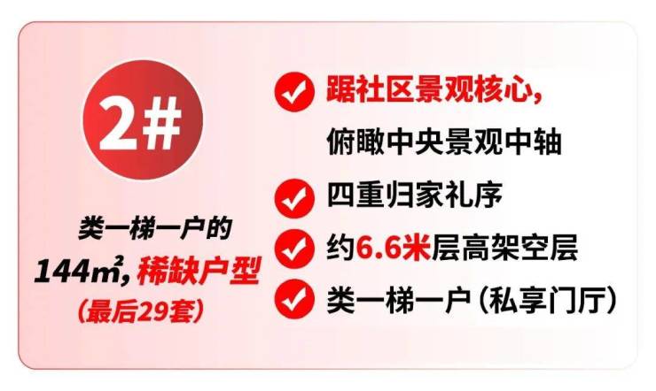 该栋约144㎡户型采用类一梯一户设计,享独立门厅体验,本次加推最后29套,席位珍贵。