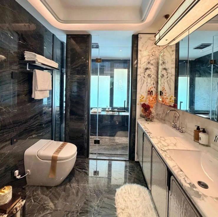 电视背景墙选用意大利超白洞石材;卫生间台面及墙面采用 芬迪白 ;来自巴西进口的静雅棕石材在有些顶豪中仅用于卫生间点缀,而在绿城黄浦ONE,则将其大量运用于地面铺装。