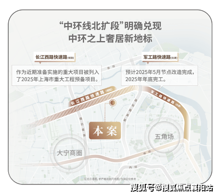 作为上海城市更新的重大规划,“中环北抬”通过延伸中环线北部三条快速路——军工路、长江西路、沪太路相互连接,形成一条全新的交通动脉,组建成为新的“中环”。