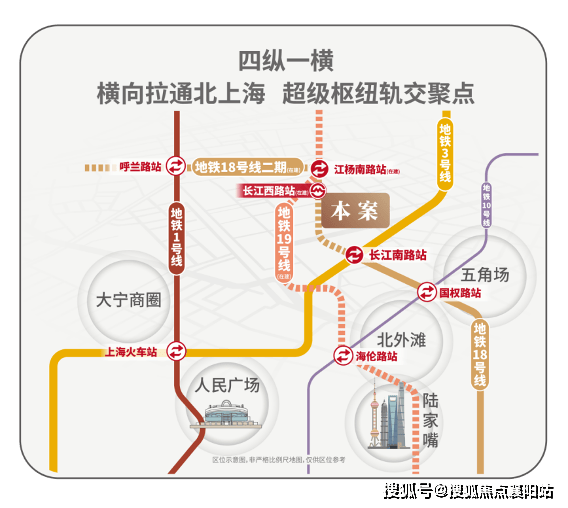 中环之上奢居新地标: 招商序择址上海源点吴淞。近代中国“四个百年”之处,拥有悠久的历史,更是北上海轨交聚点,地铁18号线横向拉通了原本纵向不相连的四线地铁:1/3/18/19,将北上海横向联通,成为区域轨交的交汇聚点;项目紧邻长江西路地铁站(直线距离约150米),1站江杨南路,5站复旦,7站五角场。