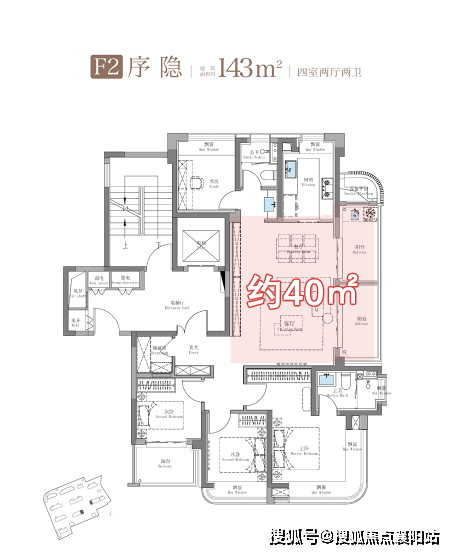 建面约143㎡还有一个侧厅户型,如果将客餐厅和双阳台打通之后,业主将获得一个约40㎡的起居空间!
