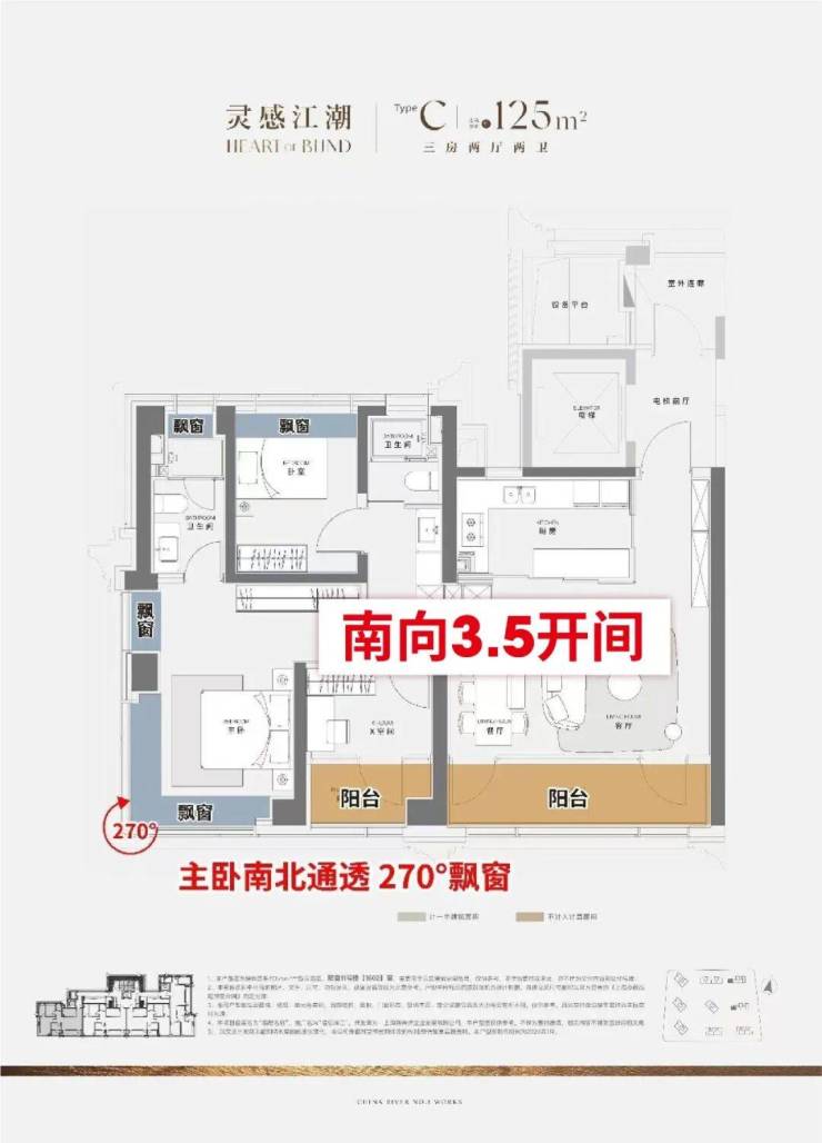 南向3.5开间+双阳台+270°转角飘窗 ,让该户型的采光性能、空间通透感几乎做到极致!