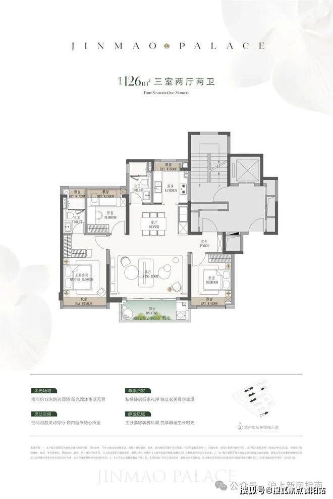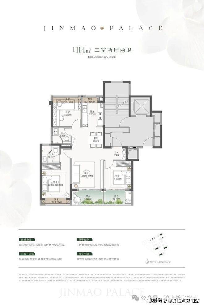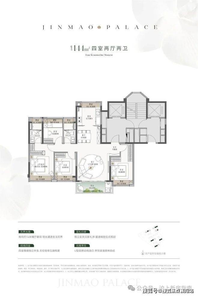 项目主推建面约114-190㎡的精装3-4房,共876户(可售住宅807套),户型设计亮点颇多: