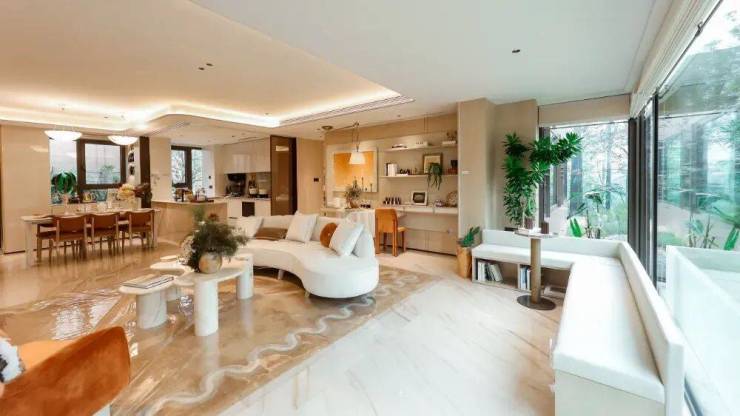 结合局部弧形玻璃与超大窗墙比,真正实现了“引景入室”,让家变成公园的观景台,重新定义了居住的视野界限。