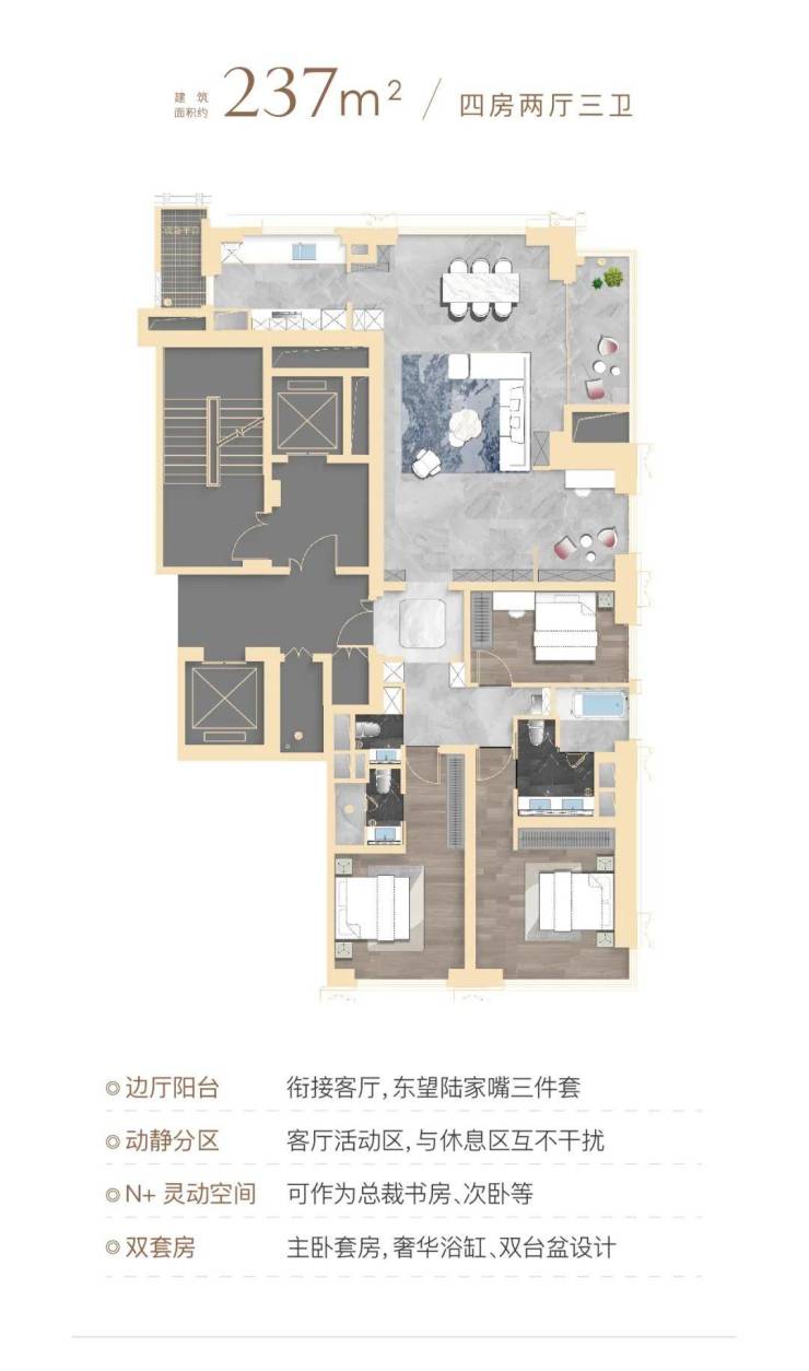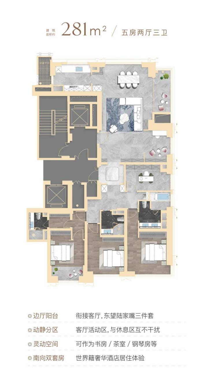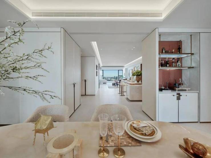 顶豪社交空间格局,普遍只有餐厅、客厅和阳台,该户型在南侧配置了一个家庭厅着实巧妙,可以是业主的茶室,也可以是女主人的手工室,当然也可作为X空间,随家庭结构和需求随心定制,书房、学习区、游戏区,女王化妆间等皆可。