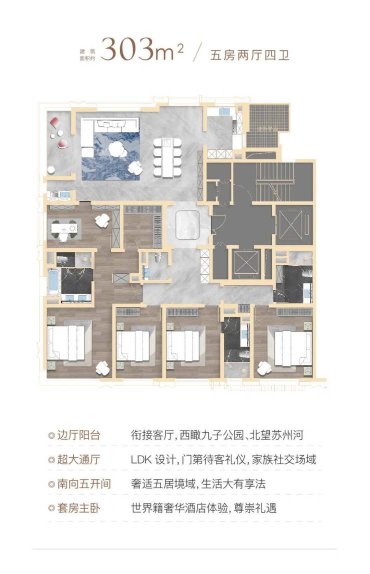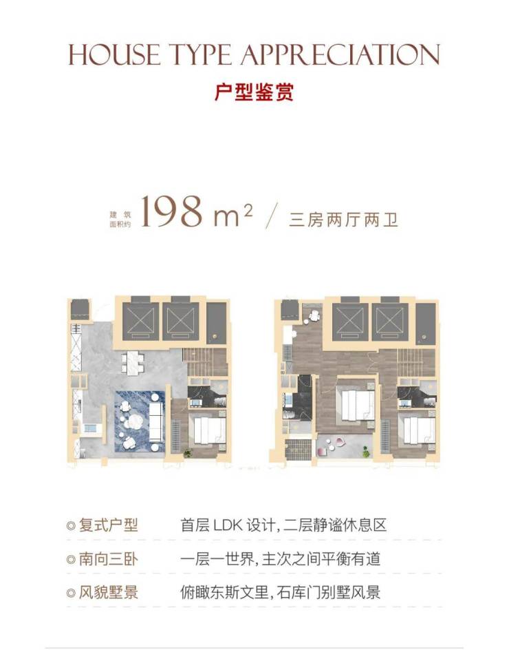 该户型只有极致景观楼层才有, 南向景观面达约13.5米 ,无遮挡,南向两个卧室均有很好的视线通达性。