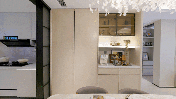 多功能水槽龙头轻松切换用水模式,滨特尔前置过滤器+末端直饮水+中央净软水机,全屋净水呵护家人饮水健康,还有线形凉霸默默为烹饪者送来清凉。所有展示橱柜皆为交付标准,包括上柜、下柜、拉篮、随心抽,以及特别定制的飘窗水槽与水槽柜——每一处细节,都为真实的生活而考虑。