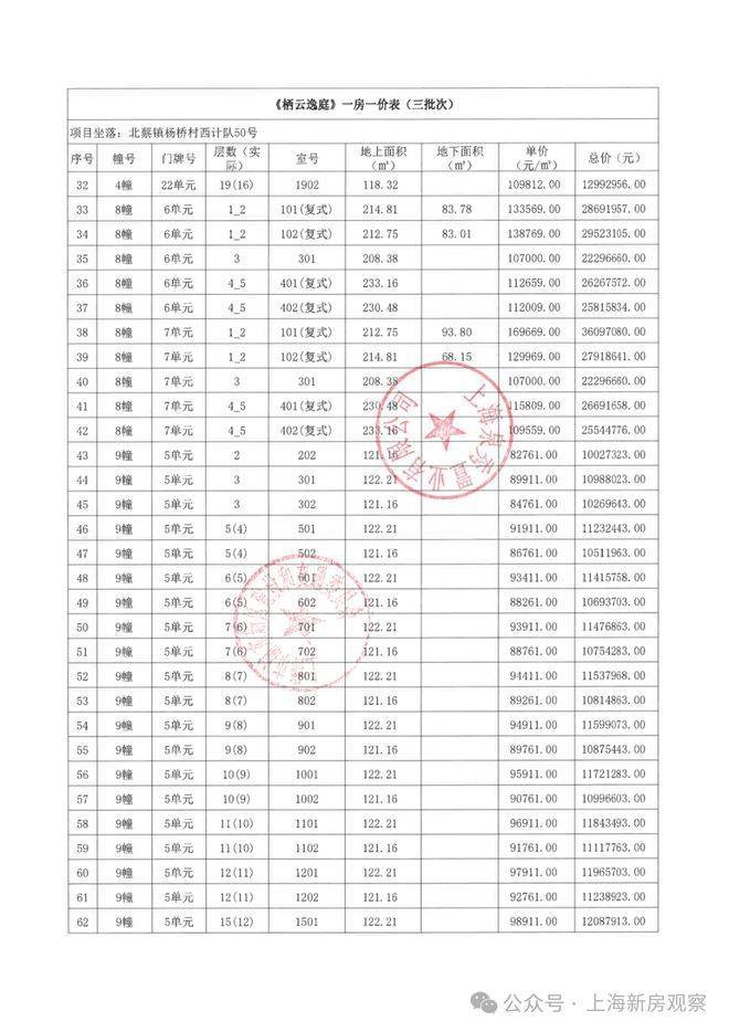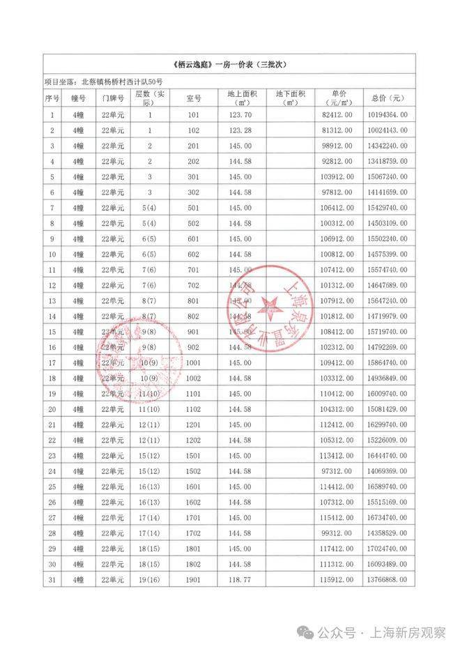 上期一房一价表如下: