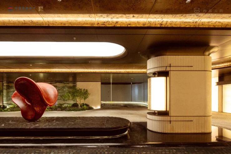走过凌云桥,眼前便是挑高达9米、宽36米的鎏金门庭。 雅柏白与香格里拉奢石镶嵌的背景墙,配合旅德艺术家LilyZhang定制的“无限云环”雕塑,气场全开。门庭两侧背景墙,选用 巴西进口的整块白水晶奢石,天然石材的肌理在灯光下流转,温润如玉。当那扇手工锻打的鎏金铜门缓缓打开,对于别人是盛大的仪式,对于业主,只是日常 。