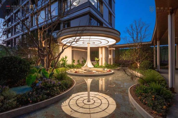 穿过森林便是利用地形高差打造的 云间谷 ,模拟山林间的徒步体验,两侧花境与红梅夹道,让你在社区内就能体验山间秘境的穿梭感。旁边的戏水池与 云间亭 ,则是夏日消暑、冬日观晚霞的绝佳去处 。