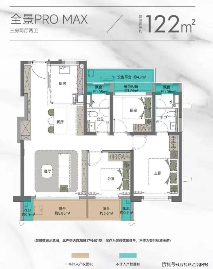 以105㎡的户型为例, “三阳台”搭配花池的设计 ,直接性价比拉满,按照规定: 阳台计一半面积,花池不计面积 ,加上 主卧+卫生间还带飘窗 (主卧飘窗非承重结构),如此算下来,对购房者而言,日常可以实打实 利用到的面积是远超市面上其他三房产品。
