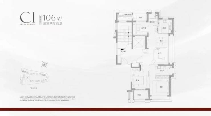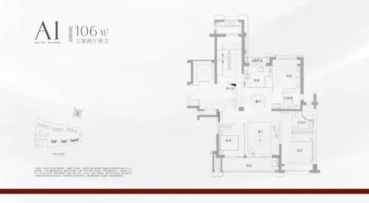 建面约106㎡三房两厅两卫(边套):三面采光,客厅270°采光窗搭配大面积飘窗,揽景入室;南北双阳台设计,兼顾功能与诗意;过道预留储物空间,细节之处尽显匠心。
