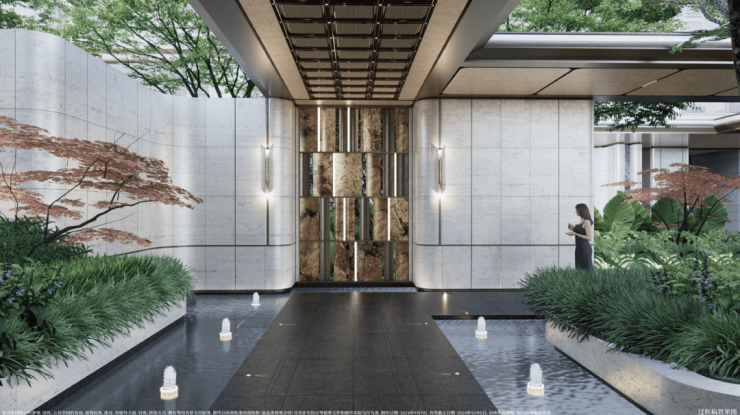 社区入口打造奢阔归家大堂,挑高设计,空间开阔,搭配艺术装饰与景观小品,彰显高端居住仪式感。穿过归家大堂,便是约 **8000㎡** 中央核心景观区,以 “迎宾、会客、休闲” 为主题,打造叠水景观、艺术雕塑、阳光草坪、名贵乔木、景观亭等多重景观节点,营造出 “一步一景、景景不同” 的归家体验。中央核心景观区贯穿社区南北,连接各大楼栋与景观节点,是社区的核心景观带与业主日常休闲、社交的核心区域。
