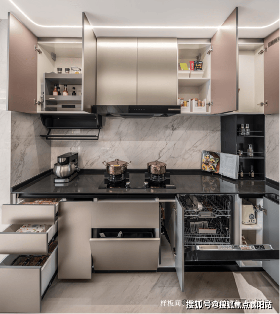 台面采用 天然大理石 ,耐磨耐用,质感高级;柜体采用高端定制橱柜,环保板材,五金件采用国际一线品牌,开合顺畅,经久耐用;水槽采用 骊住原装进口多功能水槽 ,水龙头采用高仪或当代高端龙头,品质保障,使用便捷。