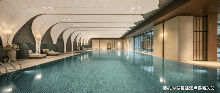 恒温泳池 :第一,采用了景德镇烧制的陶瓷马赛克,独特的釉面色彩由景德镇老师傅手工浇筑而成,充满人文艺术底蕴;第二,羽毛天花造型,由600余件铝板打造,表面采用了仿贝壳纹的艺术漆处理,带来松弛度假感;第三,不仅配置了约25m×10m的4道泳池,还采用了奥运会同款空调除湿系统,彰显高档品质细节!