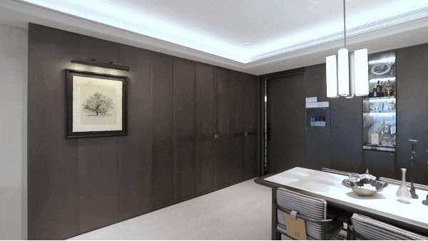 如果说吊顶是建筑的皮肤,那么墙壁便是灵魂的铠甲。卧室区域外,除了s空间,墙壁均为木饰面+岩板,并且 使用了天然昂贵的影木,橡木 。