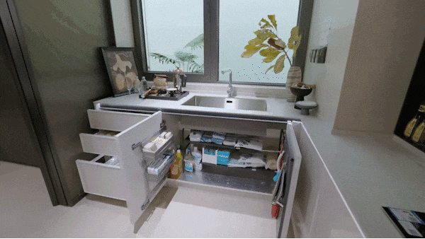 配合 抽拉置物架、地柜联动拉篮、天使下拉拉篮、三重骑马柜、随心抽、窄柜高深拉篮 的组合拳,每一种都像是为不同的物品量身定制。