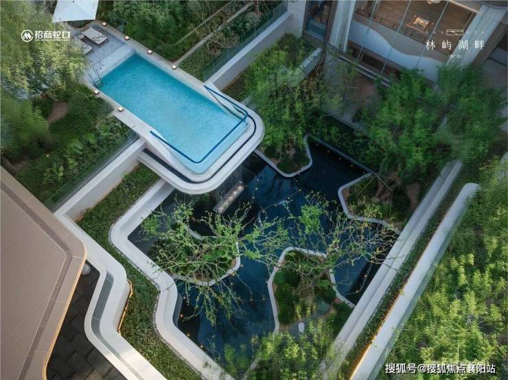 社区核心景观为 约 420㎡峡谷式立体景观 ,与外部远香湖自然植被融为一体,打造 “漂浮的绿洲” 沉浸式园林。景观采用 九重层次下沉庭院 设计,搭配 约 4.3 米飞瀑悬池 与 悬浮泳池 ,流水潺潺、绿意盎然,塑造极致度假感。