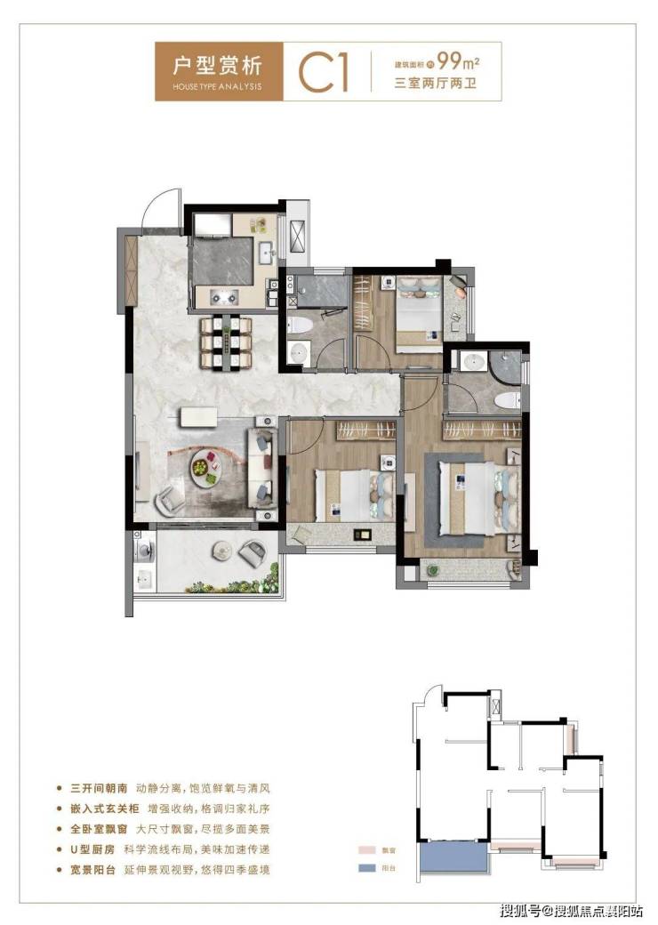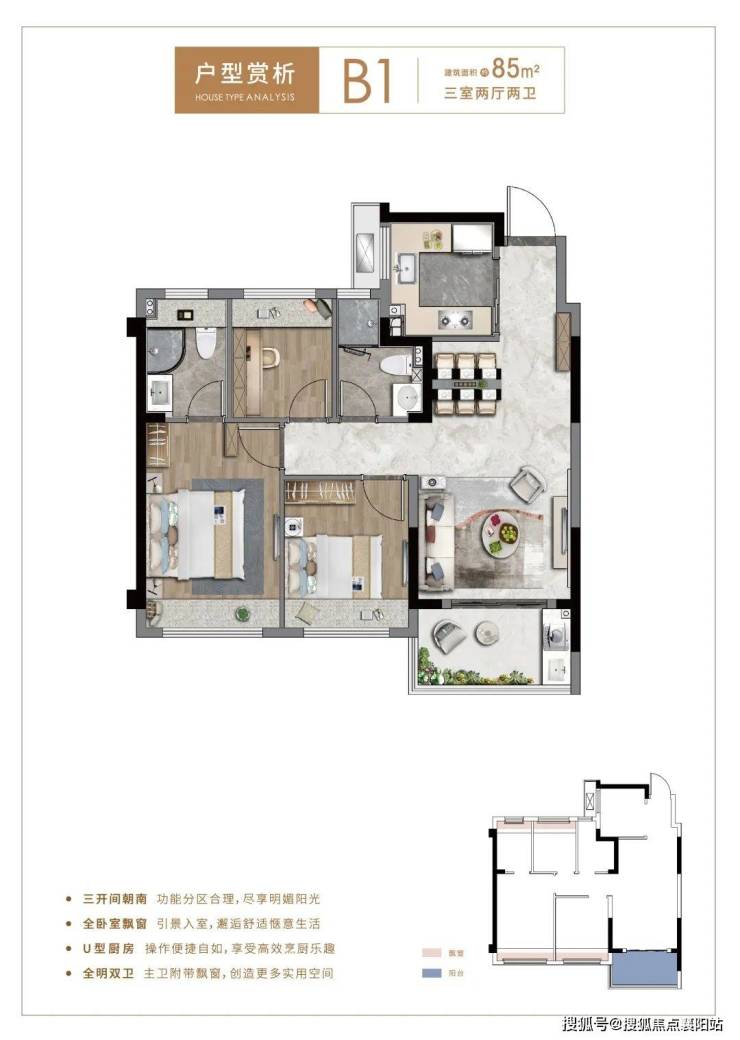 约85平三房户型, 更是做到了三开间朝南,全卧室飘窗,拥有超大赠送面积,全明双卫,甚至主卫也附带飘窗,实用性拉满,而且该户型大部分房源总价在230万左右!