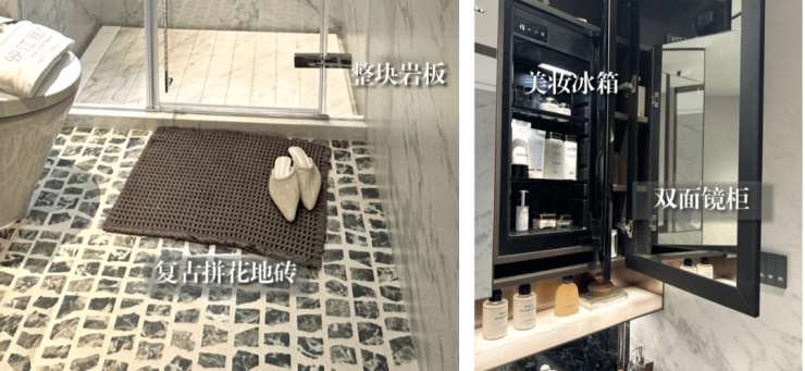卫生间:科勒 / 杜拉维特等品牌洁具,高仪 / 摩恩等品牌五金,定制浴室柜,配备浴霸、暖风机,干湿分离设计,防水防滑地砖、墙砖,品质高端、耐用美观;