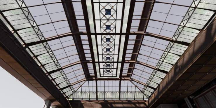 继续向里走, 廊道内可见经典的石材立柱、拱形的吊顶、PRADA荣宅的手绘彩玻、繁花的地面拼花等用材工艺 ,移步异景间,是别样的摩登魅力。