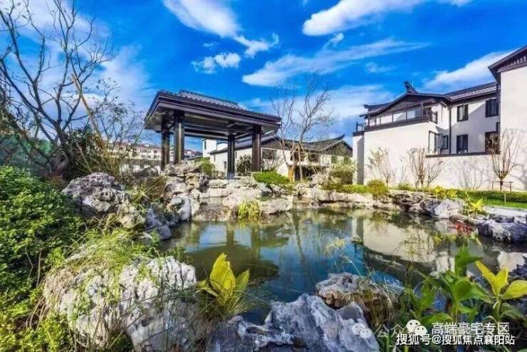 白墙黑瓦的视觉风格 ,中轴对称的大气格局,高地错落建筑造型,辅以亭台、叠水、乔木等中式景观布局,营造浓厚的中式宅院体验感。