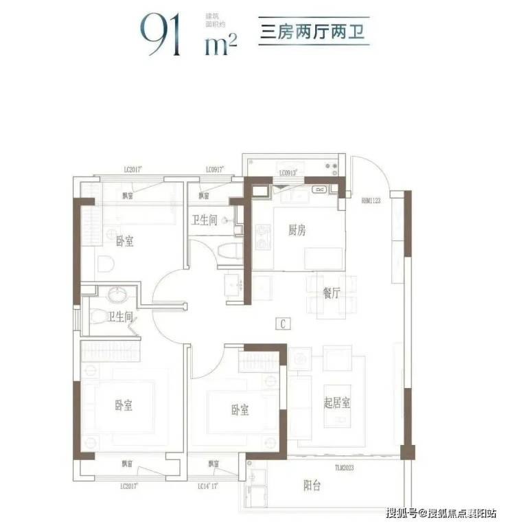 (二)建面约 91㎡ 三房两厅两卫 高层 —— 官方刚改首选(总价约 382 万起)