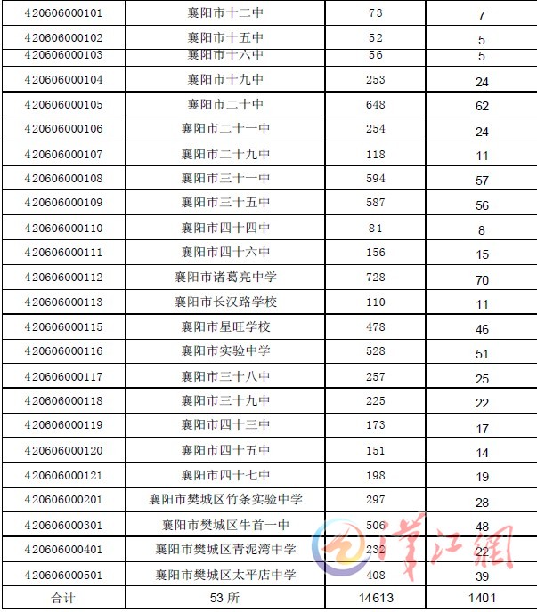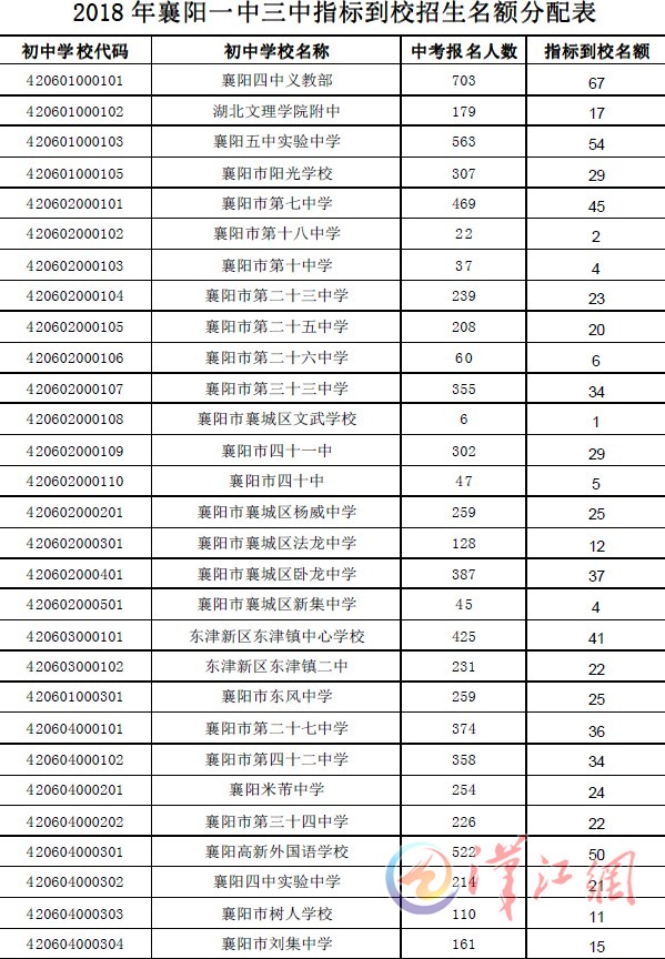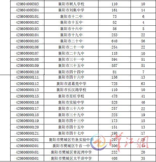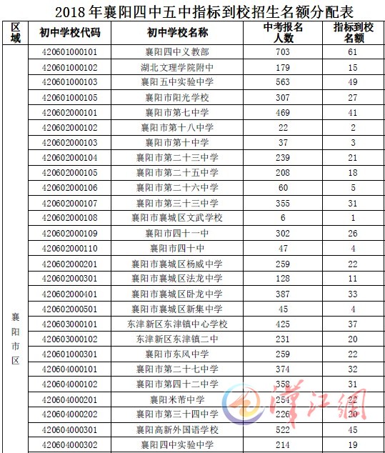另外,襄阳四中、襄阳五中填报志愿招生名额分配表公布,两校招生计划用于填报志愿统一划线(等)录取的名额共216人,按县区35%、市区65%的比例进行分配,即县(市、襄州区)分配76人,市区分配140人,具体到各城区分别为:襄城区37人,樊城区62人,高新区19人,经开区6人,东风中学初中部16人。