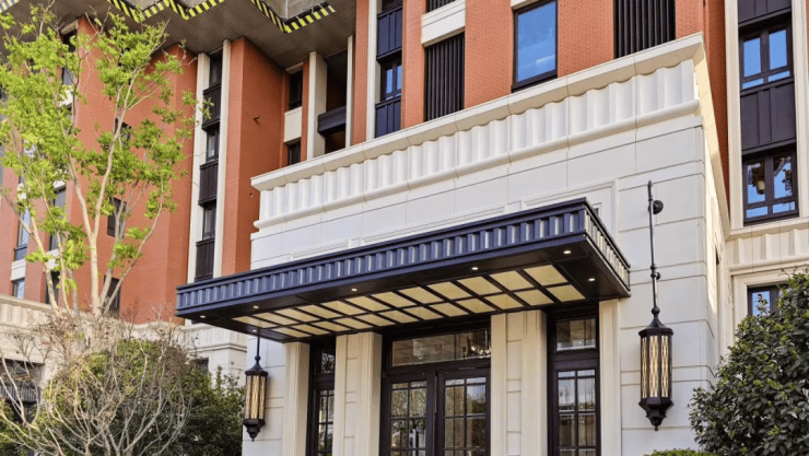 项目外立面采用红色面砖加底部葡萄牙沉香米黄石材,精致典雅且耐看,相信就算经过时间的洗礼也会经久不衰。