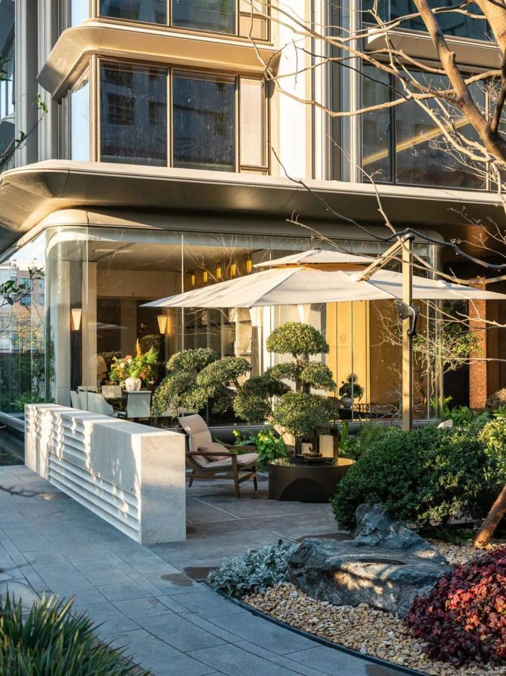 并参考世界度假酒店休憩区,在5号楼下打造一处极具松弛感的度假水院——【泊心逸境】,可在此独对山川,亦可与聆听溪谷潺潺之音。