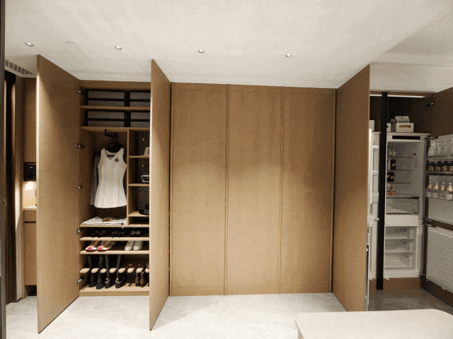 进入室内, S墙设计和整屋收纳系统,大量定制柜体把收纳这件事提前解决,玄关、餐厅、走廊全部被利用起来,小面积也能有改善级的储物能力。