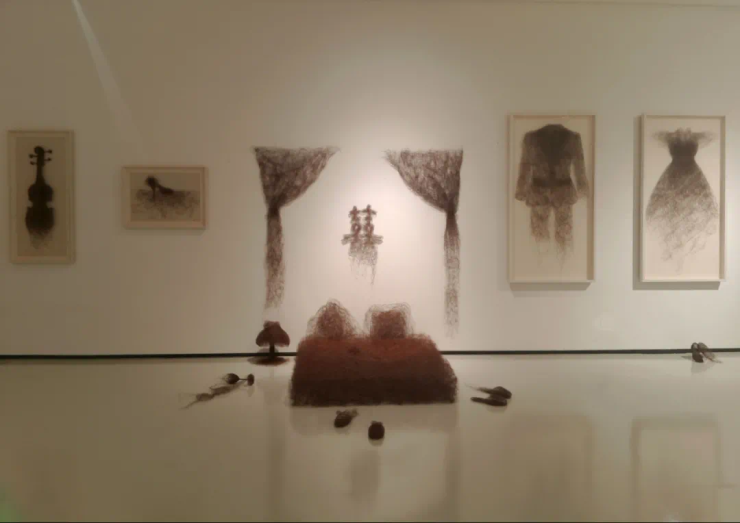 棕丝做成婚房,消失的囍字,简陋的婚床...看似美好,实则虚无之境。作品旨在探索材料和现实相对应的一种可能性。每一次与材料接触的过程都像是一场博弈,在控制与放任之间拿捏分寸。