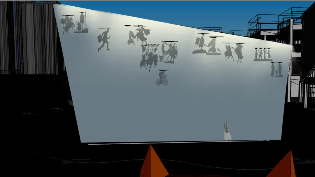 作品将襄阳三国时期金戈铁马人物的剪影与当下人们日常生活的剪影垂直于墙面,在同一天中,随着太阳东升西落,影子也会随之游走产生不同的变化。