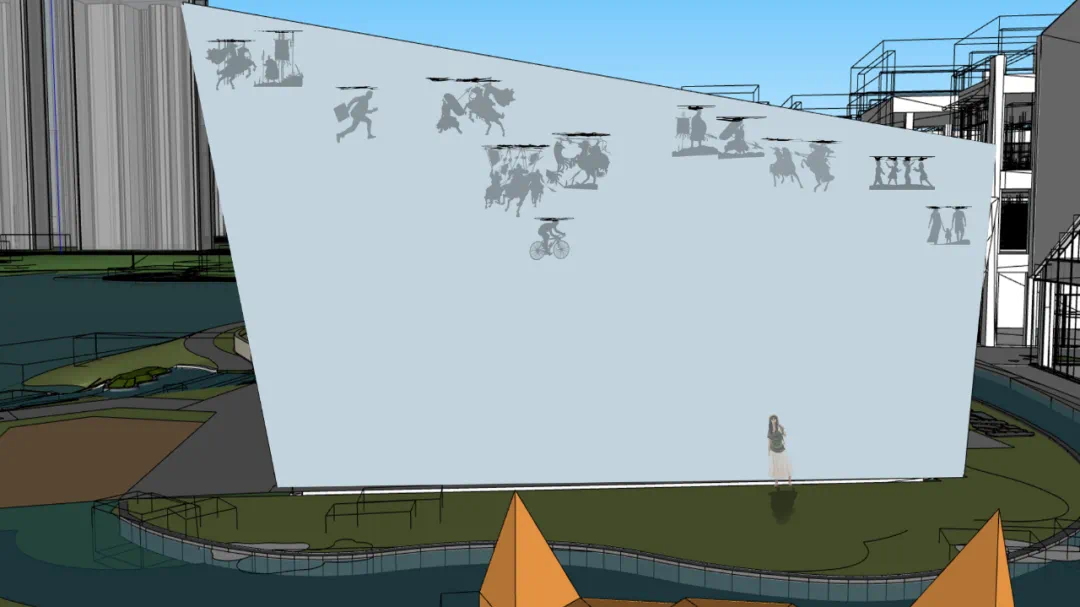 今天的襄阳和过去的襄阳是同一片土地、同一个太阳,作品将襄阳三国时期金戈铁马人物的剪影与当下人们日常生活的剪影垂直于墙面,在同一天中,随着太阳东升西落,影子也会随之游走产生不同的变化。